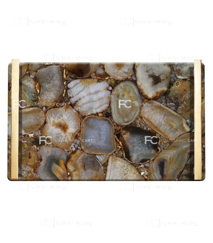 Brown agate gemstone luxury serving tray with brass finish handles.