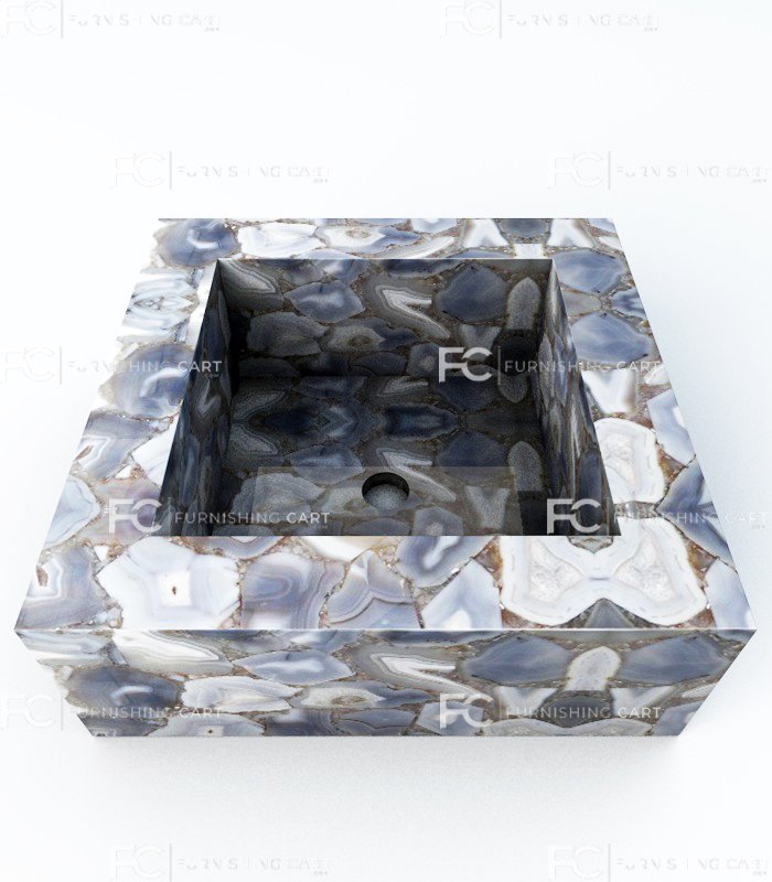 Square shape backlit wash basin vessel sink in grey agate chalcedony geode semi precious gemstone.