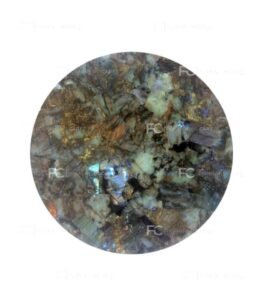 The Labradorite Round Table (R108) is a beautiful luxury table made from real labradorite gemstone. The stone shows natural flashes of blue, green, gold and other colors when light hits the surface. This shining effect is called “labradorescence,” and it makes every piece look unique and elegant.