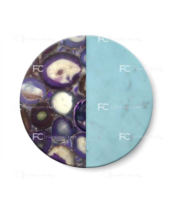 Exclusive chopping board in purple agate geode precious stone and white marble – Round design.
